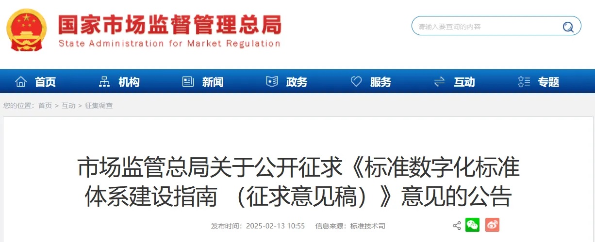 為深入貫徹落實黨中央、國務院關于推動標準化工作向數字化、網絡化、智能化轉型的決策部署,實施《國家標準化發展綱要》和《質量強國建設綱要》,充分發揮標準的基礎性、引領性作用,加快構建結構合理、層次分明、適應經濟社會高質量發展的標準數字化標準體系。市場監管總局起草了《標準數字化標準體系建設指南 (征求意見稿)》,現向社會公開征求意見,意見反饋截止日期為2025312日。公眾可以通過以下途徑和方式提出意見: