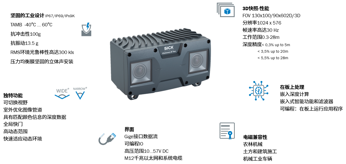 出口市場拓展:中國工程機械出口占比持續提升(2023年挖掘機出口占比41%),東南亞、非洲等地區對性價比高、適應性強的設備需求旺盛。SICK3D雙目相機Visionary-B Two便于快速適配不同地區機械標準,搶占海外智能化升級先機。