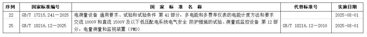 兩項標準分別為:GB/T 17215.241—2025《電測量設備 通用要求、試驗和試驗條件 第41部分:多電能和多費率儀表的電能計度方法和要求》、GB/T 18216.12—2025《交流1000V和直流1500V及以下低壓配電系統電氣安全 防護措施的試驗、測量或監控設備 第12部分:電量測量和監視裝置(PMD)》。
