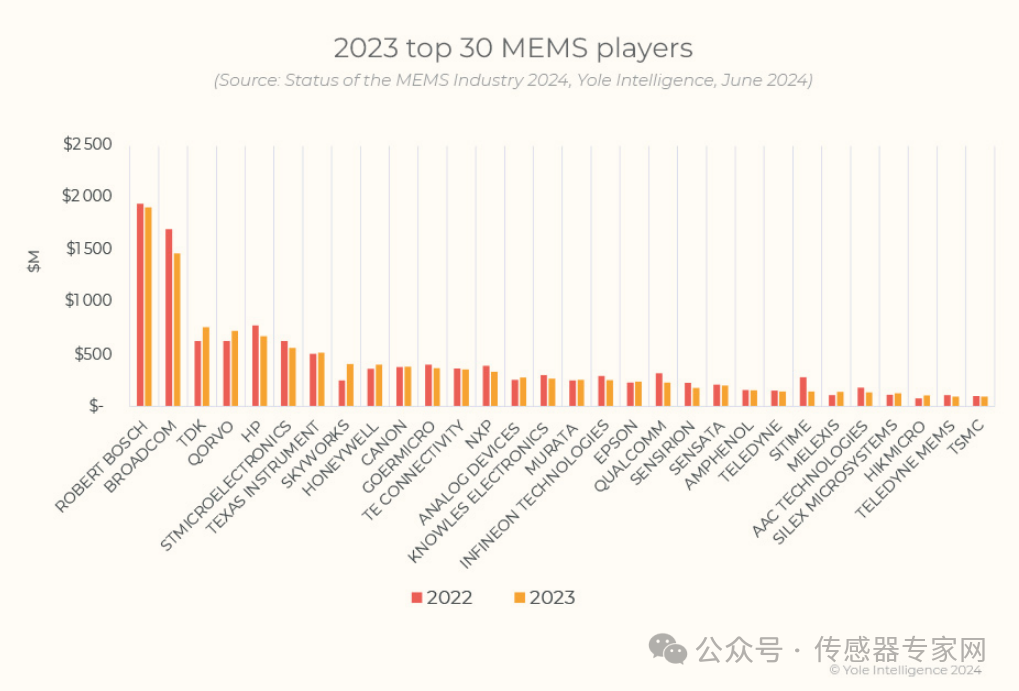 從全球MEMS廠商TOP 30名單來看,來自美國的廠商有Broadcom(博通)、Qorvo、Hewlett Packard(惠普)、Texas Instruments(德州儀器)、Skyworks、Honeywell(霍尼韋爾)、Analog Devices(ADI)、Knowles Electronics(樓氏電子)、Qualcomm(高通)、Sensata(森薩塔)、Amphenol(安費諾)、Teledyne(FLIR,MEMS)、Si Time等,占據(jù)榜單的近一半。