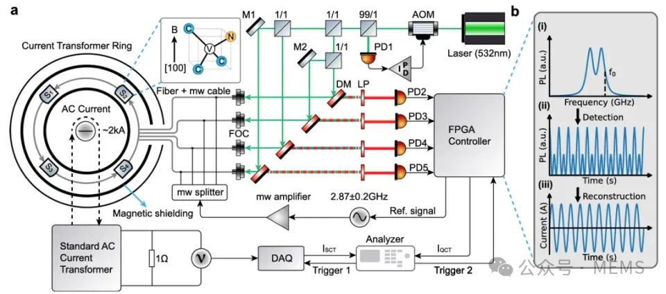 孫方穩(wěn)團隊長期開展金剛石量子傳感器件的加工制備研究,攻克了系列關(guān)鍵技術(shù)。為了解決電流測量難題,此次研究中團隊采用光纖-金剛石傳感器進行高壓電流測量,四個集成化金剛石量子傳感器均勻分布在磁屏蔽環(huán)中,其[100]晶向與交流磁場平行以提高信噪比。研究提出了在零偏置磁場下對熒光信號進行倍頻轉(zhuǎn)換和加權(quán)平均的處理方法,該方法能夠重構(gòu)50赫茲交流電的波形;同時,為了拓寬電流測量動態(tài)范圍,采用共振頻率跟蹤方法,保持金剛石傳感器對不同大小電流導(dǎo)致磁場變化的敏感性;針對實際應(yīng)用中系統(tǒng)溫度變化影響測量精度的問題,通過雙頻量子控制方法可抑制溫度漂移;最后在0至1000安培范圍內(nèi)進行電流測量,將測量結(jié)果與標(biāo)準(zhǔn)電流互感器進行對比,實現(xiàn)了0.05%的測量精度。