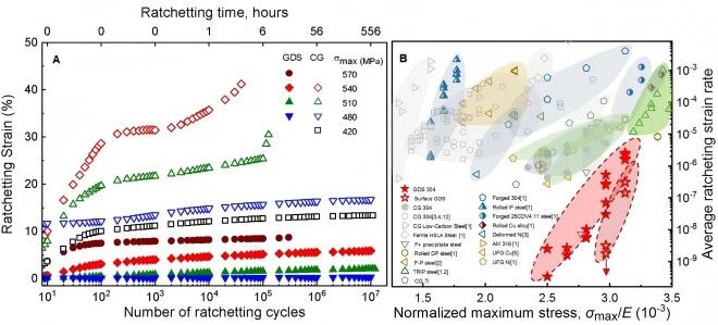 盧磊研究團隊與海外合作者共同提出了一種基于梯度位錯結構的高強度材料抗疲勞策略,通過在傳統304奧氏體不銹鋼中引入空間梯度序構位錯胞結構,成功實現了高強度與優異抗循環蠕變性能的協同優化。該策略使材料屈服強度提升了2.6倍;與具有相同強度的不銹鋼及其他合金相比,其棘輪應變速率降低了2-4個數量級(圖),突破了結構材料抗棘輪損傷性能難以提升的技術瓶頸。