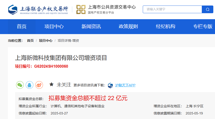 與此同時(shí),維科網(wǎng)關(guān)注到,新微集團(tuán)還在上海聯(lián)合產(chǎn)權(quán)交易所發(fā)布增資項(xiàng)目公告,擬募集資金總額不超過(guò)22億元,且本次公開(kāi)掛牌增資已獲得其第一大股東上海聯(lián)和投資有限公司的批復(fù)。