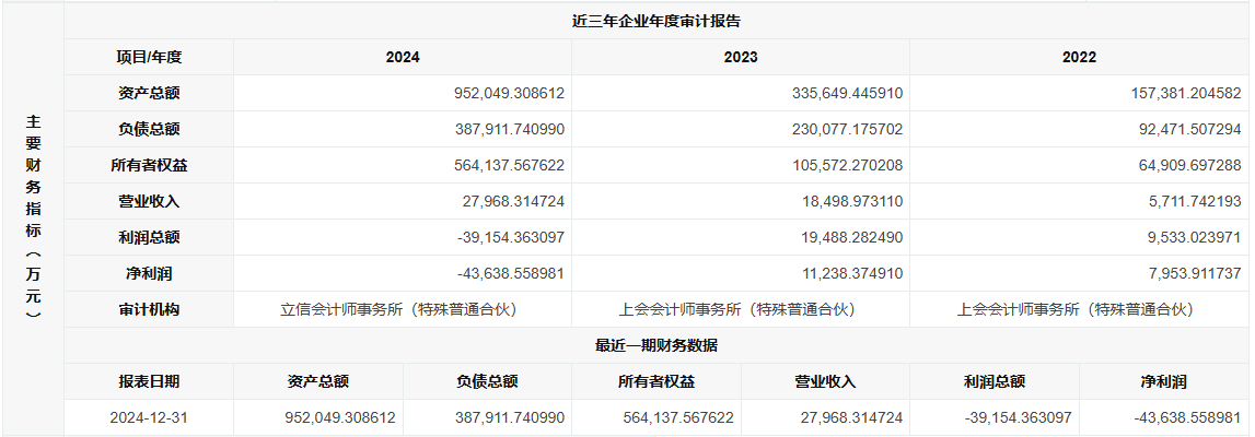 資產(chǎn)總額方面,2022年至2024年從15.74億元增長(zhǎng)至95.2億元;負(fù)債總額從9.25億元增長(zhǎng)至38.79億元;所有者權(quán)益從6.49億元增長(zhǎng)至56.41億元。
