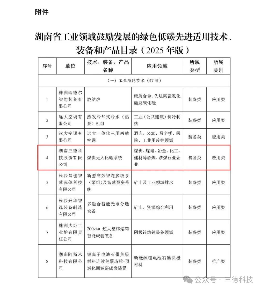 近日,湖南省工業(yè)和信息化廳發(fā)布《湖南省工業(yè)領(lǐng)域鼓勵(lì)發(fā)展的綠色低碳先進(jìn)適用技術(shù)、裝備和產(chǎn)品目錄(2025年版)》,三德科技(股票代碼:300515)自主研發(fā)的煤炭無人化驗(yàn)系統(tǒng)(SDIAS)成功入選,標(biāo)志著該裝備在智能化檢測(cè)與綠色低碳領(lǐng)域的創(chuàng)新價(jià)值獲得政府高度認(rèn)可。