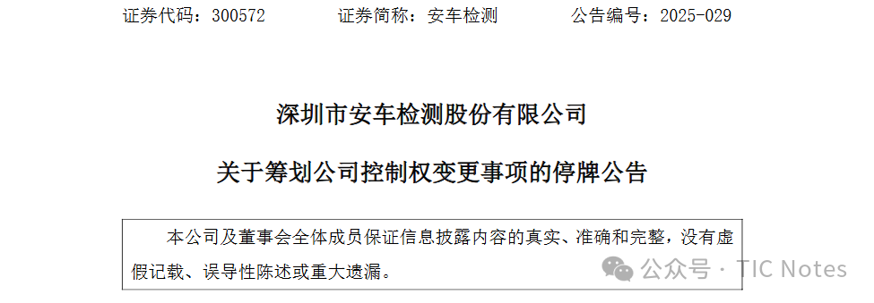 2025年7月29日,深圳市安車檢測股份有限公司發(fā)布《關于籌劃公司控制權變更事項的停牌公告》,公告顯示,公司于今日收到控股股東及實際控制人賀憲寧的通知,其正在籌劃股權轉(zhuǎn)讓及控制權變更相關事宜,該事項可能導致公司控股股東和實際控制人發(fā)生變更。目前各方尚未簽署相關正式交易協(xié)議,擬就具體交易方案、協(xié)議等相關事項進行論證和磋商,具體情況以各方簽訂的相關正式交易協(xié)議為準。