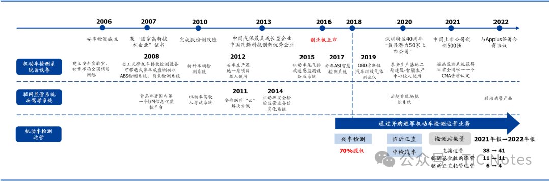 據(jù)悉,安車檢測成立于2006年,2010年完成股份制改造,2016年于創(chuàng)業(yè)板上市。公司為機動車檢測綜合服務商,業(yè)務覆蓋全國31個省市,初期主業(yè)圍繞機動車檢測系統(tǒng)及檢測行業(yè)聯(lián)網(wǎng)監(jiān)管系統(tǒng),為業(yè)內(nèi)少數(shù)可提供系統(tǒng)方案設計、安裝集成、運營維護及行業(yè)監(jiān)管等全鏈條服務的檢測設備供應商之一,下游客戶主要包括全國各地的機動車檢驗機構、汽車制造廠、科研機構等。2018年公司通過收購興車檢測70%股權切入機動車檢測站運營,加速向下游產(chǎn)業(yè)鏈延伸,產(chǎn)業(yè)鏈布局持續(xù)完善。