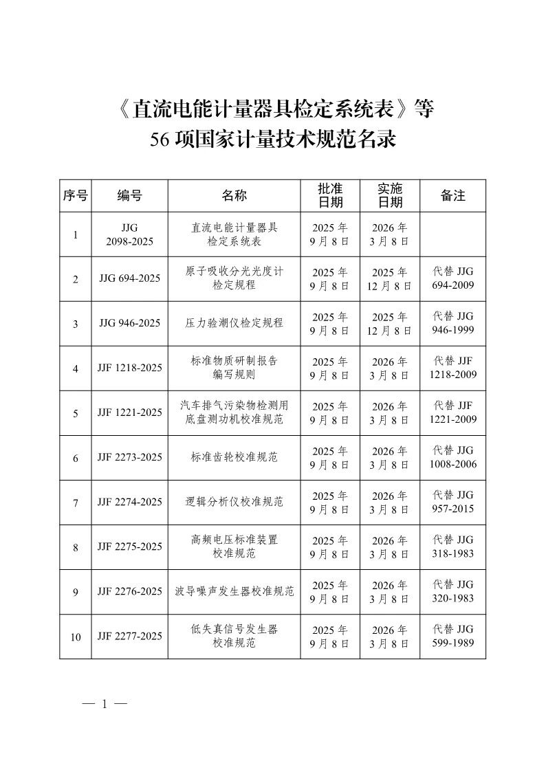 根據(jù)《中華人民共和國計量法》有關規(guī)定,批準《直流電能計量器具檢定系統(tǒng)表》等56項國家計量技術規(guī)范發(fā)布實施,現(xiàn)予公告。