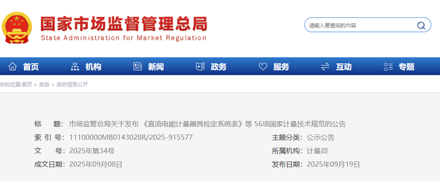 市場監(jiān)管總局關于發(fā)布《直流電能計量器具檢定系統(tǒng)表》等56項國家計量技術規(guī)范的公告