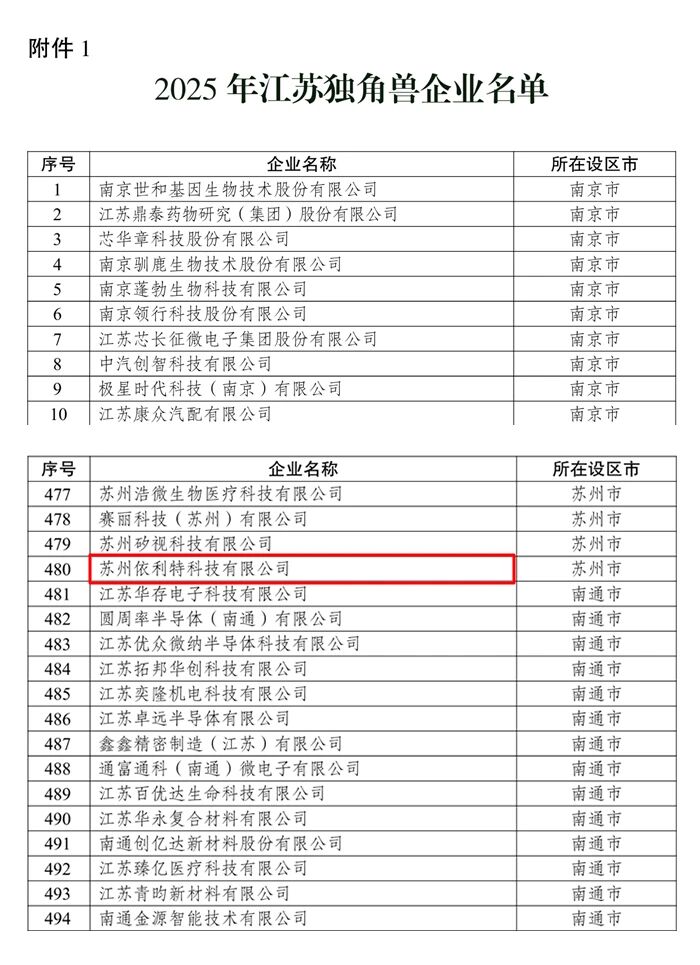 近日,江蘇省新質(zhì)生產(chǎn)力促進(jìn)中心正式發(fā)布《關(guān)于發(fā)布 2025 年江蘇獨(dú)角獸企業(yè)評估結(jié)果的通知》,經(jīng)過嚴(yán)格遴選與專業(yè)評估,蘇州依利特科技有限公司憑借在技術(shù)創(chuàng)新、產(chǎn)業(yè)潛力與高質(zhì)量發(fā)展貢獻(xiàn)方面的突出表現(xiàn),成功榮登 2025 年江蘇獨(dú)角獸企業(yè)名單,成為江蘇省高成長企業(yè)群體中的代表之一。
