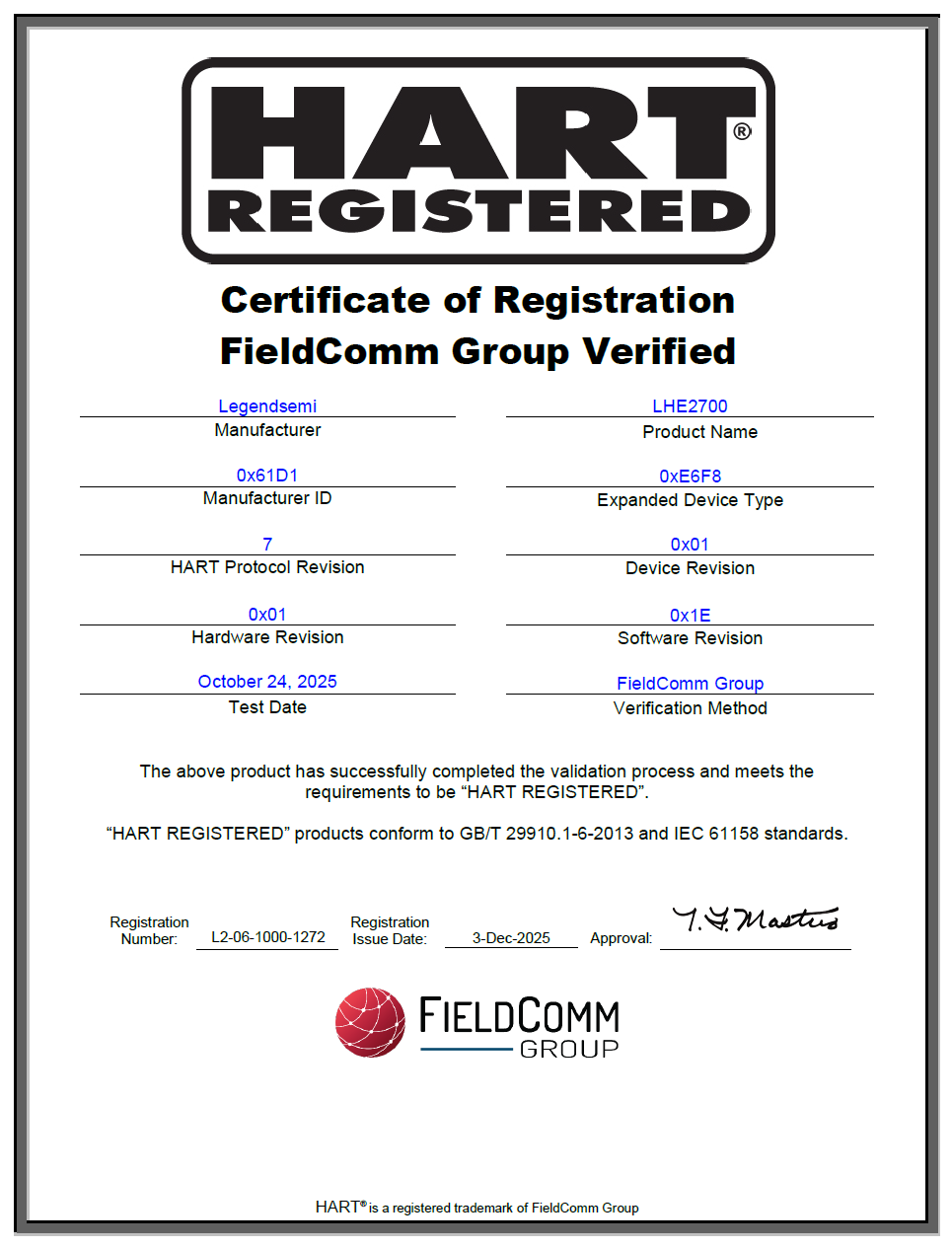 近日,領(lǐng)慧立芯旗下LHE2700 集成精密振蕩器的低功耗 HART 調(diào)制解調(diào)器,成功通過國際權(quán)威機(jī)構(gòu) FieldComm Group 的 HART® 通信協(xié)議認(rèn)證。這一里程碑式的突破,不僅標(biāo)志著 LHE2700 在工業(yè)通信協(xié)議兼容性、技術(shù)可靠性上達(dá)到國際標(biāo)準(zhǔn),更意味著國產(chǎn)工業(yè)級(jí)模擬芯片在關(guān)鍵領(lǐng)域?qū)崿F(xiàn)了與國際先進(jìn)水平的精準(zhǔn)對(duì)標(biāo),為工業(yè)自動(dòng)化設(shè)備的國產(chǎn)化升級(jí)注入強(qiáng)勁 “芯” 動(dòng)力。