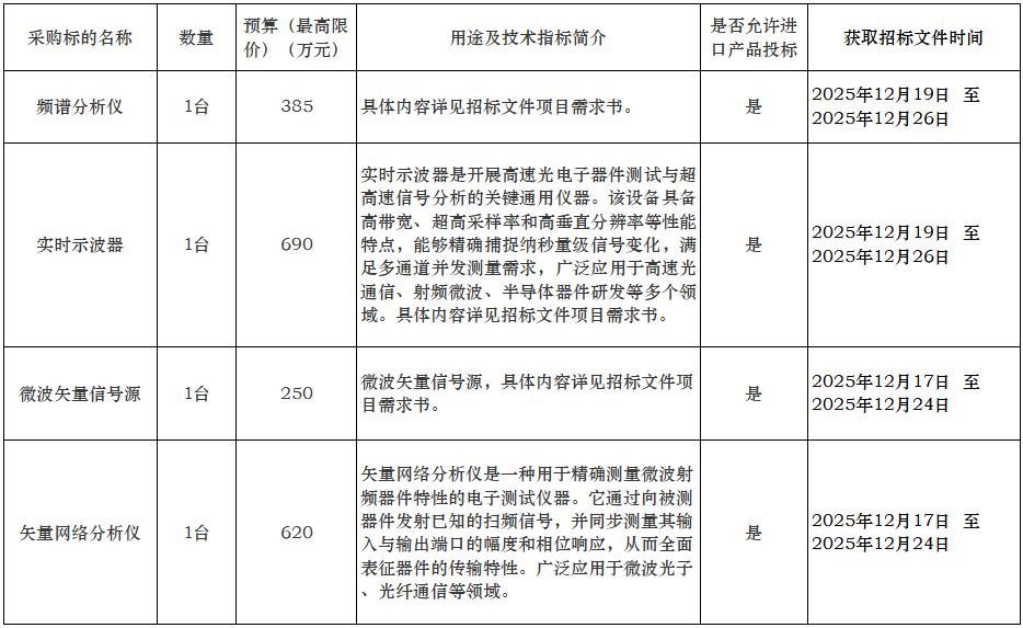 2025 年12月17日至12月19日,南開大學(xué)智能光子研究院在中國政府采購網(wǎng)連續(xù)發(fā)布四項招標公告,預(yù)算金額1945萬元,涉及四款最高端的電子測試儀器:預(yù)算620萬元矢量網(wǎng)絡(luò)分析儀1臺、預(yù)算250萬元微波矢量信號源1臺、預(yù)算385萬元頻譜分析儀1臺、預(yù)算690萬元實時示波器1臺。
