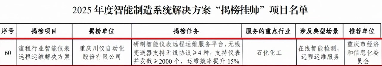 重慶川儀自動(dòng)化股份有限公司(以下簡稱“川儀股份”)“流程行業(yè)智能儀表遠(yuǎn)程運(yùn)維解決方案”成功上榜工信部2025年度智能制造系統(tǒng)解決方案“揭榜掛帥”項(xiàng)目名單。