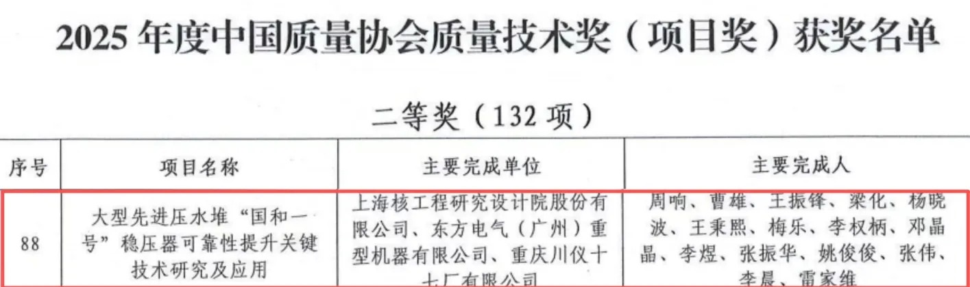 重慶川儀十七廠有限公司(以下簡稱“川儀十七廠”)與上海核工程研究設(shè)計(jì)院股份有限公司、東方電氣(廣州)重型機(jī)器有限公司聯(lián)合攻關(guān)的“大型先進(jìn)壓水堆‘國和一號(hào)’穩(wěn)壓器可靠性提升關(guān)鍵技術(shù)研究及應(yīng)用”項(xiàng)目,榮獲2025年中國質(zhì)量協(xié)會(huì)“質(zhì)量技術(shù)獎(jiǎng)”二等獎(jiǎng)。