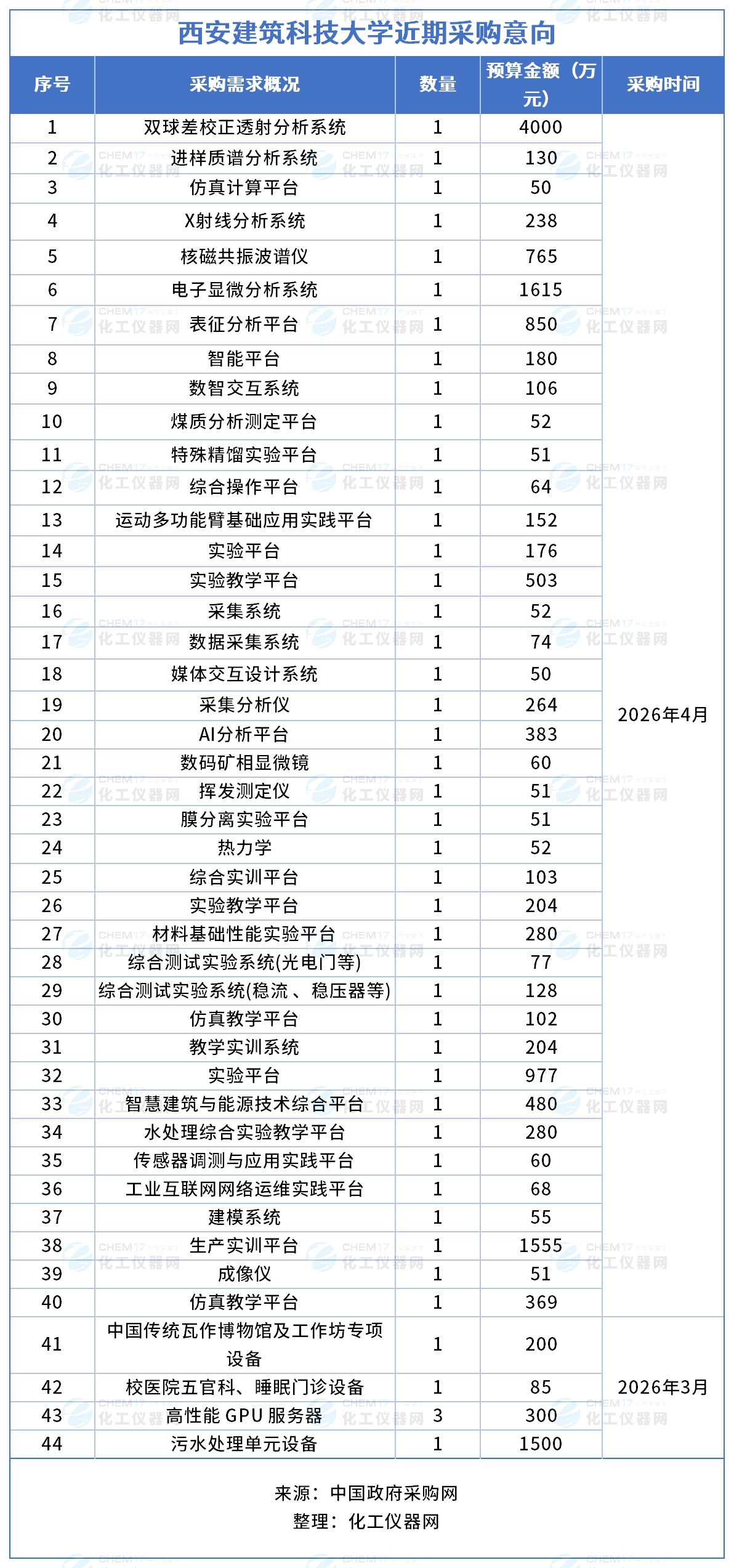 近期,西安建筑科技大學(xué)發(fā)布多項(xiàng)儀器采購(gòu)意向,采購(gòu)預(yù)算金額17047萬元,涉及儀器設(shè)備包括雙球差校正透射分析系統(tǒng)、進(jìn)樣質(zhì)譜分析系統(tǒng)、仿真計(jì)算平臺(tái)、X射線分析系統(tǒng)、核磁共振波譜儀、電子顯微分析系統(tǒng)等。預(yù)計(jì)采購(gòu)時(shí)間2026年3月-4月。