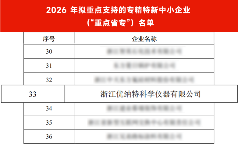 近日,浙江省經濟和信息化廳公示了2026年擬重點支持的專精特新中小企業(“重點省?!保┟麊?。400家企業實施融通入鏈“四提一強”推進計劃。浙江優納特科學儀器有限公司憑借雄厚的技術創新能力和市場影響力,成功入選。