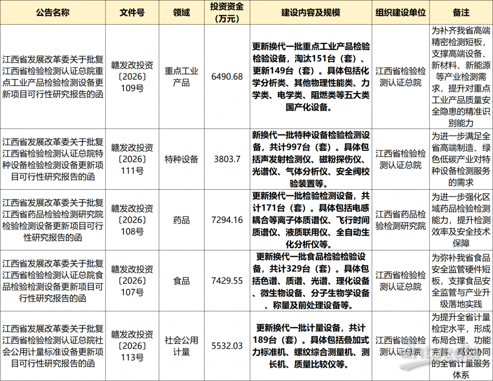 近日,江西省發(fā)展改革委密集批復(fù)重點(diǎn)工業(yè)產(chǎn)品、特種設(shè)備、藥品、食品、社會(huì)公用計(jì)量五大領(lǐng)域檢驗(yàn)檢測(cè)設(shè)備更新項(xiàng)目,總投資達(dá)28769.42 萬元,旨在全面提升全省質(zhì)量安全保障能力,支撐高端制造、綠色低碳等重點(diǎn)產(chǎn)業(yè)高質(zhì)量發(fā)展。
