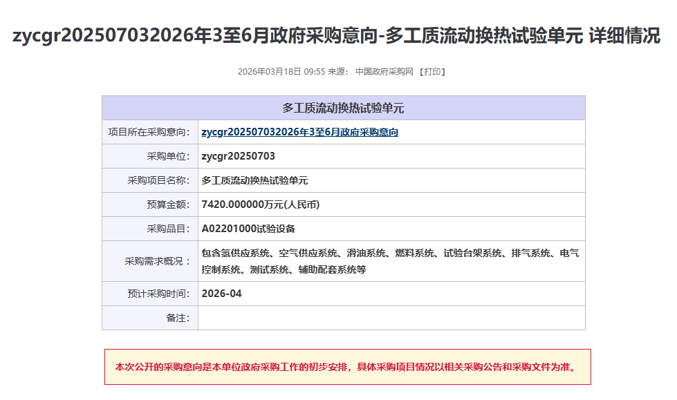近期,zycgr20250703發(fā)布兩項(xiàng)儀器采購(gòu)意向,采購(gòu)預(yù)算金額11568萬(wàn)元,涉及儀器設(shè)備包括多工質(zhì)流動(dòng)換熱試驗(yàn)單元、熱管理系統(tǒng)多元耦合特性試驗(yàn)設(shè)備,預(yù)計(jì)采購(gòu)時(shí)間2026年4月。