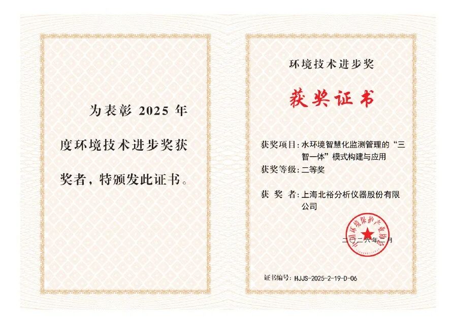 近日,上海北裕分析儀器股份有限公司在環保科技領域捷報頻傳,先后榮獲中國環境保護產業協會2025年度環境技術進步獎二等獎,與廣東省環境保護產業協會2025年度科學技術獎(環境技術進步獎)一等獎。兩項殊榮既是對北裕儀器創新成果的肯定,也充分體現了各方合作單位協同攻關、共同推動水環境監測技術進步的重要成效。