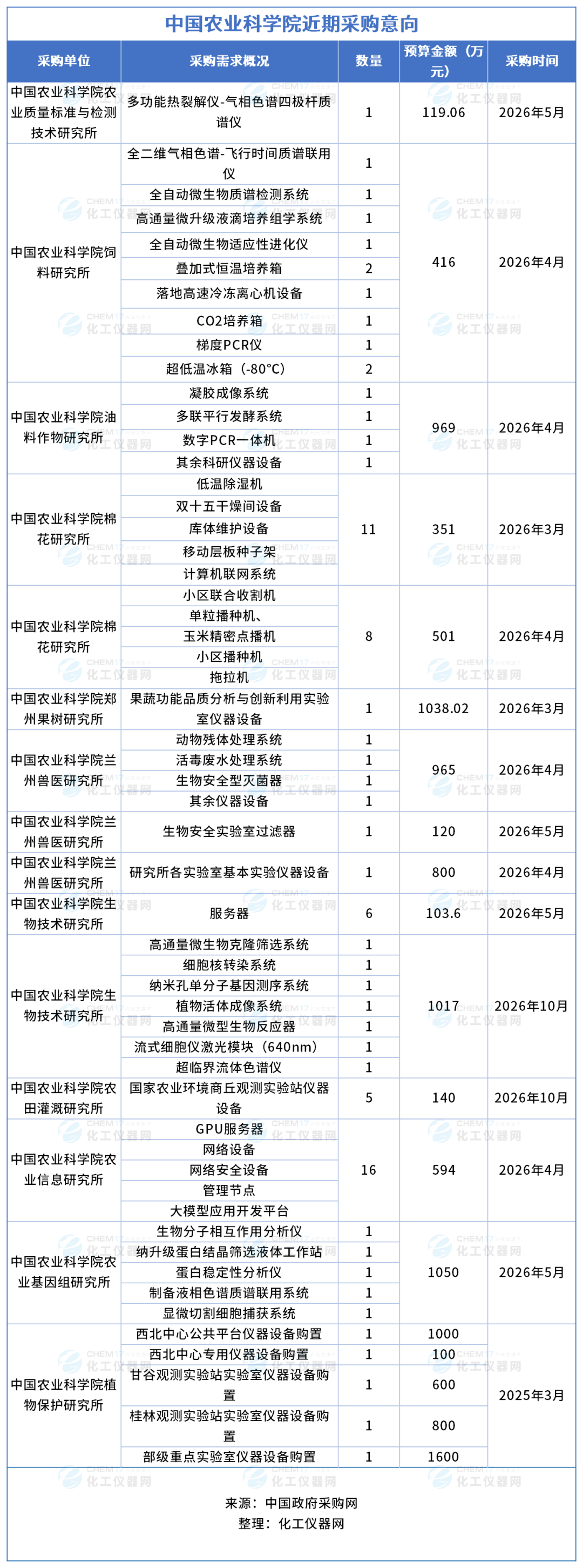 近期,中國(guó)農(nóng)業(yè)科學(xué)院各院所發(fā)布多項(xiàng)儀器采購(gòu)意向,采購(gòu)預(yù)算金額12283.68萬(wàn)元,涉及儀器設(shè)備包括多功能熱裂解儀-氣相色譜四極桿質(zhì)譜儀、全二維氣相色譜-飛行時(shí)間質(zhì)譜聯(lián)用儀、全自動(dòng)微生物質(zhì)譜檢測(cè)系統(tǒng)、高通量微升級(jí)液滴培養(yǎng)組學(xué)系統(tǒng)、全自動(dòng)微生物適應(yīng)性進(jìn)化儀、疊加式恒溫培養(yǎng)箱、落地高速冷凍離心機(jī)設(shè)備等。預(yù)計(jì)采購(gòu)時(shí)間2026年3月-10月。