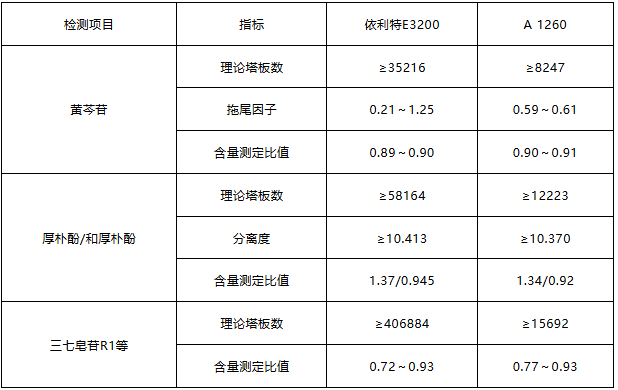驗評參照《中國藥典》及相關(guān)藥品、食品檢驗標準方法,包括:(1)黃芩苷、厚樸酚與和厚樸酚、三七皂苷等中藥材成分的測定方法;(2)實際樣品測試中直接與某品牌1260 HPLC進行平行比對。