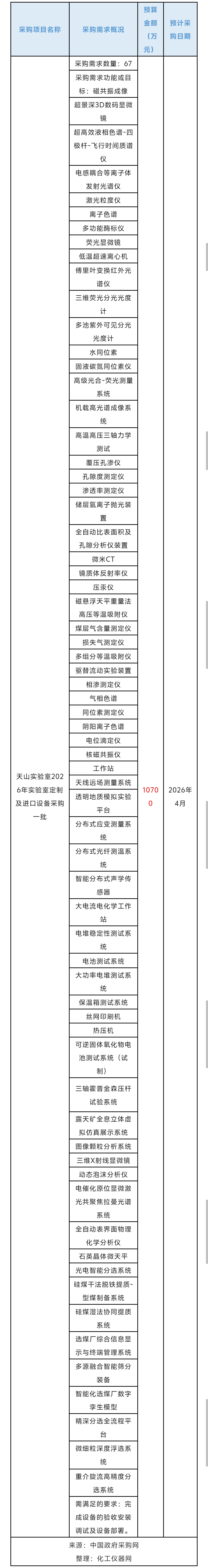 近日,天山實驗室發布一批實驗室設備采購意向,計劃采購超高效液相色譜-四極桿-飛行時間質譜儀、電感耦合等離子體發射光譜儀、激光粒度儀、離子色譜、多功能酶標儀等設備,預算總金額1.07億元。預計采購時間2026年4月。